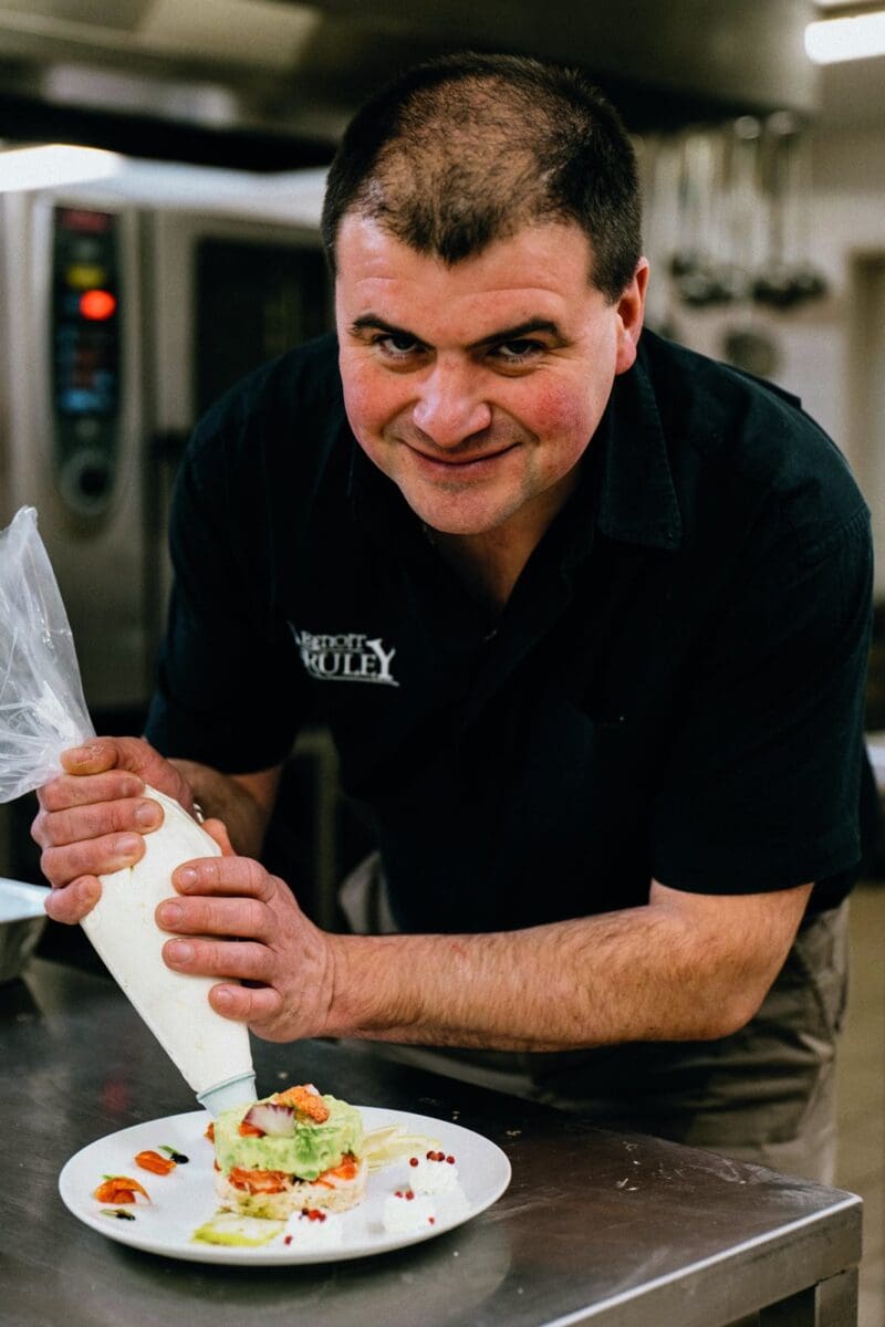 Sa discrétion, Benoît Bruley en fait un atout pendant les soirées. « L’objectif est d’être présent constamment, à l’écoute, sans perturber la soirée. » Le service a son importance, tout autant que la bibliothèque de saveurs que propose Benoît Bruley. Avec plus d’une cinquantaine de plats proposés à sa carte, lui et sa brigade rendent hommage au terroir local. Il faut le voir nous concocter sa trilogie de tartares à l’avocat, au céleri acidulé et à la chair de homard, pour se rendre compte que chaque création est un vrai régal pour les papilles comme pour les yeux. « Ce qui m’anime au fond, c’est l’envie de partager des saveurs et des moments de vie. »