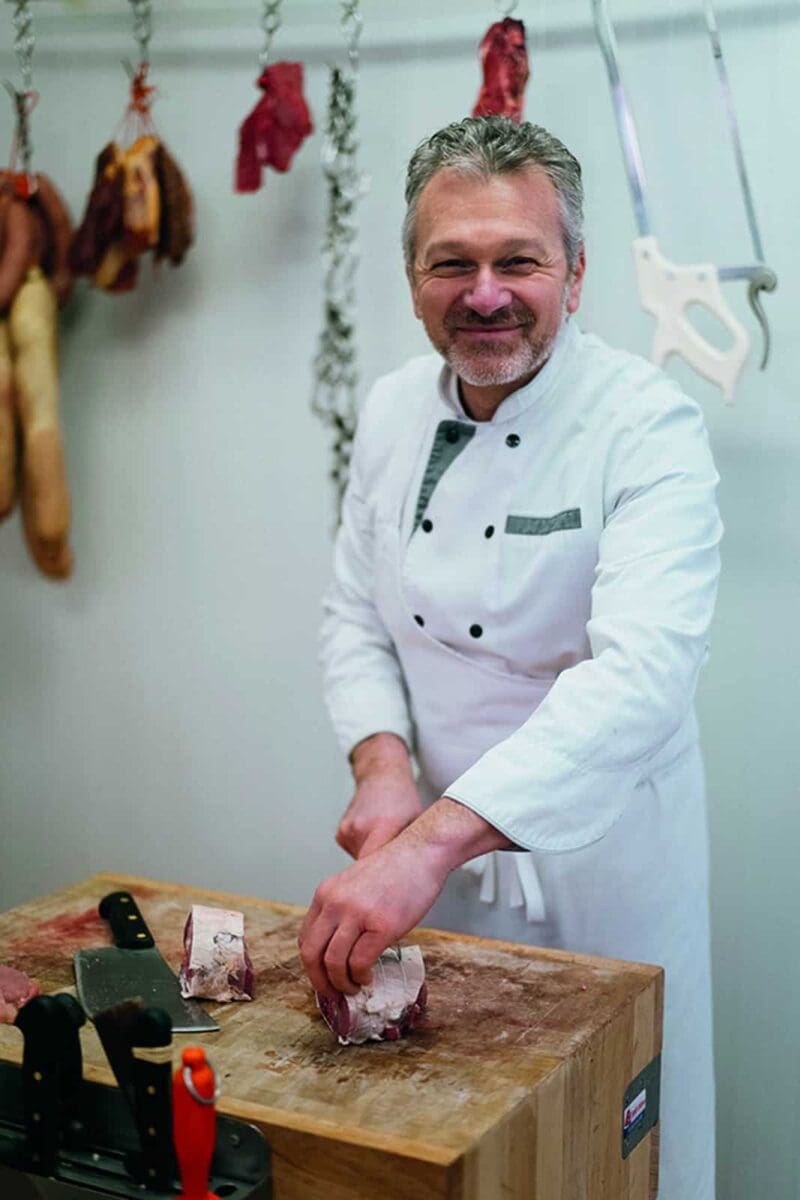 Incarnant la troisième génération de bouchers-charcutiers, Serge Alviset, apprenti dans l’entreprise paternelle qu’il a reprise en 2008, perpétue une certaine tradition. Celle de l’amour du bon morceau de viande de qualité. « Notre manière de travailler est restée la même. Nous achetons les bêtes sur pied, nous fabriquons tout dans notre laboratoire et 80 % de nos charcuteries sont faites maison. » Pour trouver les meilleurs morceaux, Serge se déplace directement chez les éleveurs du coin avec qui il a lié des relations de confiance : viandes charolaises, agneaux de Saulx-le-Duc, volailles fermières des Landes, porcs fermiers en label et veaux élevés sous la mère, tout respire la qualité dans cette boucherie qui emploie huit personnes. Côté charcuterie, le jambon persillé reste la grande spécialité de la maison – avec une recette secrète transmise de génération en génération, qui ravit les nombreux habitués. Bien implanté dans son terroir, il n’hésite pourtant pas non plus à faire découvrir d’autres cultures : viande de Galice d’Espagne, Black Angus d’Irlande, bœuf de Kobe…